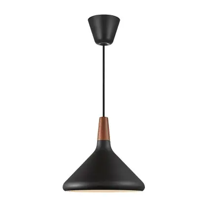 Die Nordlux Pendelleuchte aus der Modellreihe Nori zeichnet sich durch ein modernes Design und einen schicken Materialmix aus. Der Lampenschirm besteht aus Metall. Das Markenzeichen der Modellserie ist die Holzspitze in geöltem Nussbaum. Hinweis: Die Leuchte kommt ohne Leuchtmittel daher - passende E27 LED-Lampen finden Sie jedoch in unserem Shop.