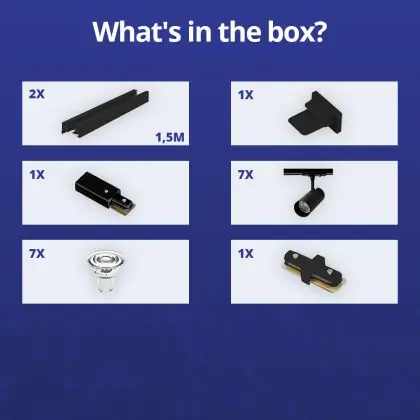 Beschreibung Komplettset 1-Phasen Rail 3 Meter Schwarz | incl. 7x Spot + GU10 2700K 3W Dimmbar + Abschlusskappe, Stromanschluss und I-Verbinder