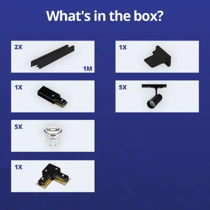 Beschreibung Komplettset 1-Phasen Rail L 1 x 1 Meter Schwarz | incl. 5x Spot + GU10 2700K 3W Dimmbar + Abschlusskappe, Stromanschluss und L -Verbinder