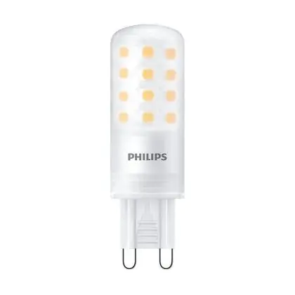 Die Mehrfachpackung 12x Philips CorePro LED Capsule G9 Matt 4W 480lm - 827 Extra Warmweiß | Dimmbar - Ersatz Für 40W ist eine effiziente G9 LED-Lampe und der perfekte Ersatz für Ihre konventionelle Halogenlampe mit 40W und einem G9-Sockel. Die Stifte haben einen Abstand von 9 mm. Zudem strahlt das Produkt Licht in der Farbtemperatur 2700K - Extra Warmweiß aus und punktet durch eine lange Lebensdauer.
