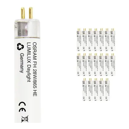 Die Mehrfachpackung 20x Osram Lumilux T5 FH HE 28W - 865 Tageslichtweiß | 115cm ist eine T5 Leuchtstoffröhre von Osram mit einer Länge von 1150 mm. Das Produkt verfügt über 2 Pins und hat einen Durchmesser von 16 mm. Die Röhre strahlt Licht in der Farbtemperatur 6500K - Tageslichtweiß aus und punktet durch eine lange Lebensdauer.