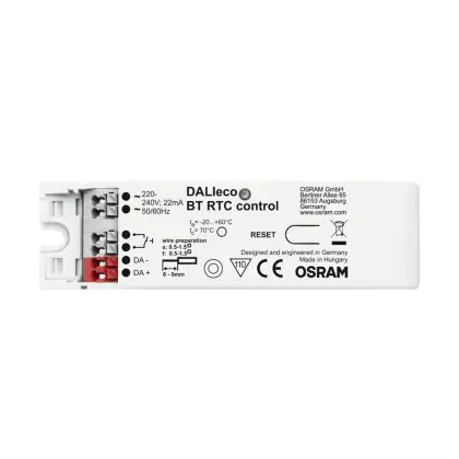 Die Osram Steuerungseinheit DALIeco eignet sich zur tageszeitabhängigen Änderung der Helligkeit und Farbtermperatur. Mit dem Produkt können Sie Ihre Beleuchtung über Ihr Smartphone steuern und anpassen. Sie können bis zu 4 Timer mit An-/Aus-Zeit und Wochentag einstellen. Dank vordefinierter Funktionsmodi ist die Inbetriebnahme sehr einfach. Mögliche Anwendungsgebiete sind Stehleuchten, Büro- und Besprechungsräume, Klassenzimmer, Korridore und Shopbeleuchtung.