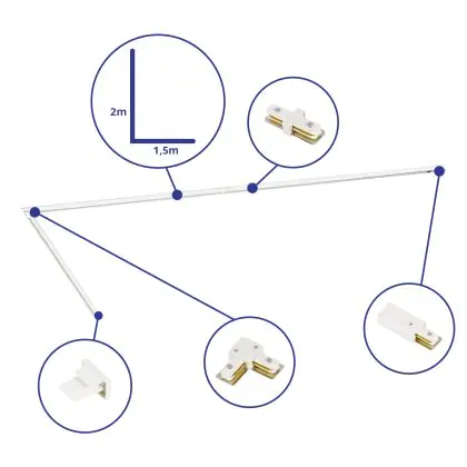 Beschreibung Rail Set 1-Phasen L 1,5 x 2 Meter Weiß | incl. Abschlusskappe, Stromanschluss und L -Verbinder